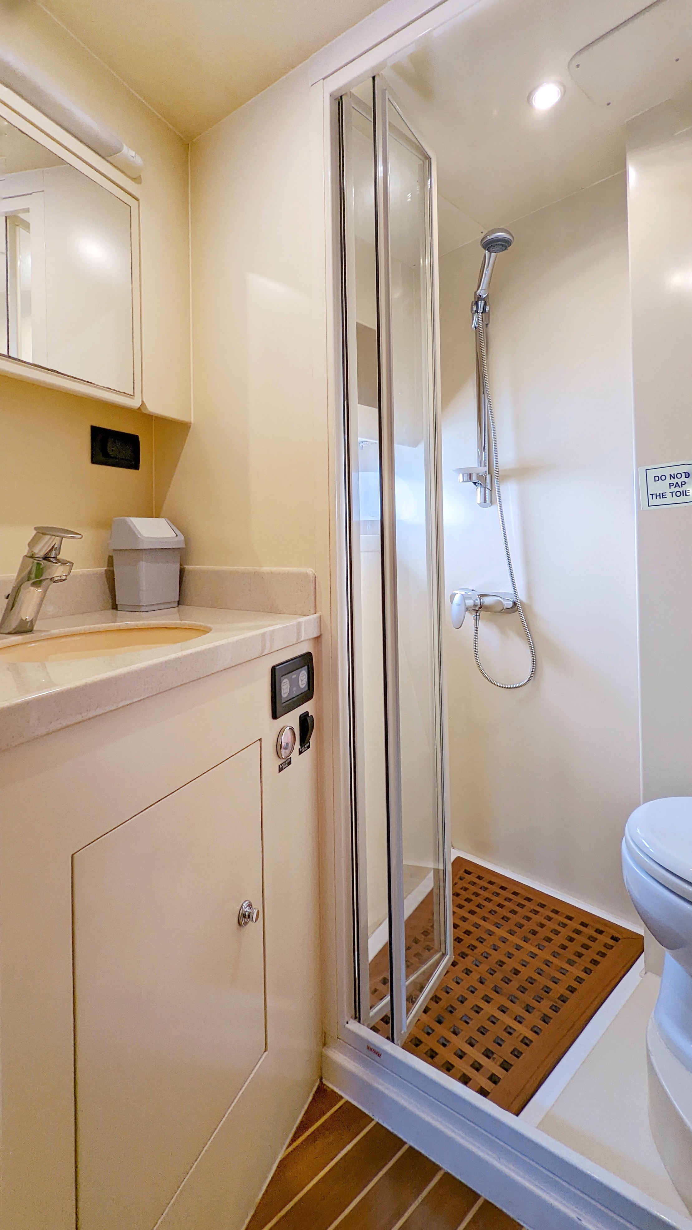 MnF yacht is a 51ft Majesty 50 cabin cruiser capable to accommodate up to 25 guests. It is double decked with the flybridge on upper deck providing 360 degree panaromic view of the surrounding while sheltered from scoorching sun with a canvas installed. The lower deck houses an air-conditioned saloon with sofa, dining table, galley, 3 cabins and 2 bathrooms.